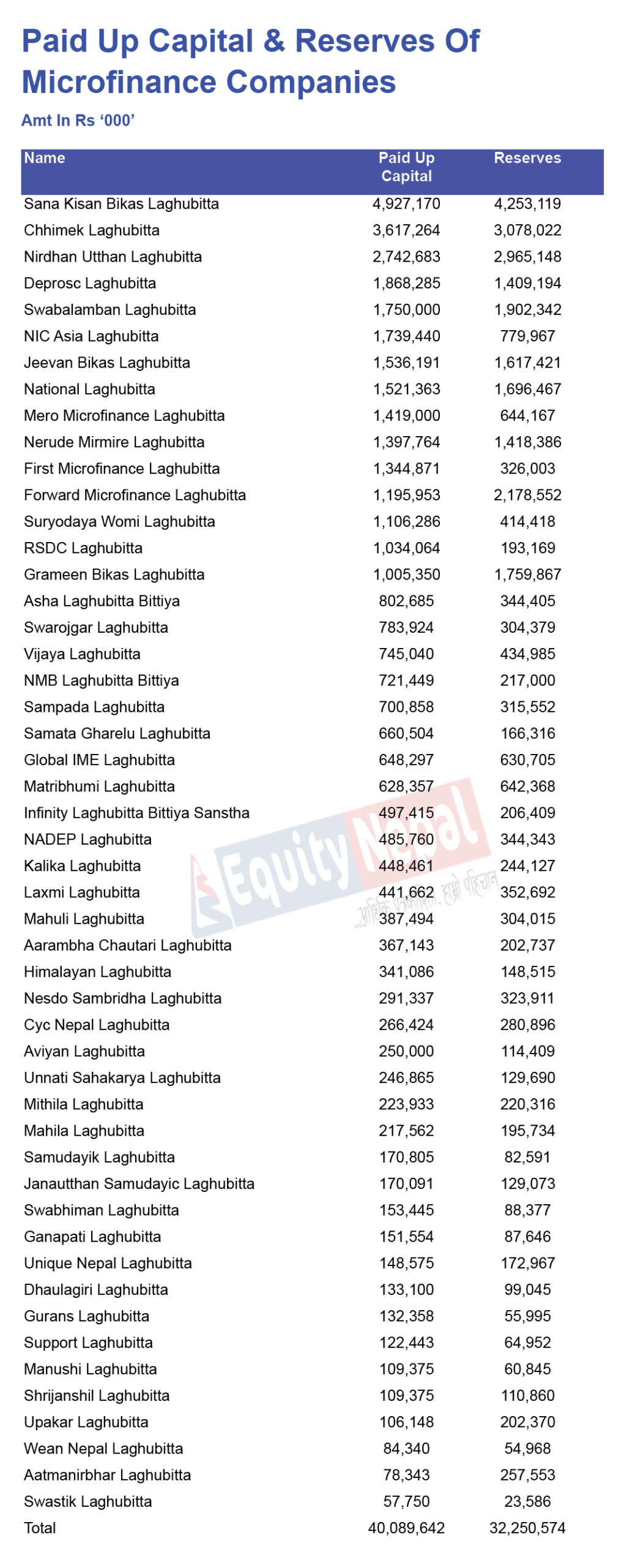 १५ वटाको चुक्ता पुँजी १ अर्ब भन्दा धेरै छ । समग्रमा लघुवित्तहरुको चुक्ता पुँजी ४० अर्ब ८ करोड ९६ लाख रुपैयाँ छ । भने जगेडा कोषमा लघुवित्तहरुको ३२ अर्ब २५ करोड जम्मा रहेको छ । जसमध्ये, साना किसानको जगेडा कोषमा ४ अर्ब २५ करोड ३१ लाख रुपैयाँ जम्मा रहेको छ । छिमेकको जगेडामा ३ अर्ब ७ करोड रुपैयाँ रहेको छ ।