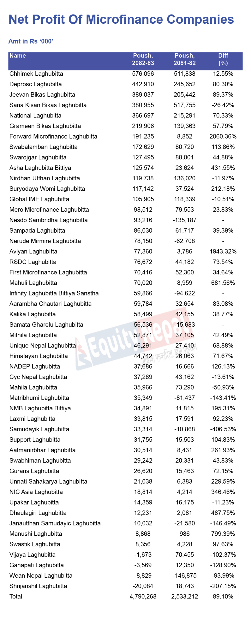 ५० वटा लघुवित्तमध्ये सबैभन्दा धेरै चुक्ता पुँजी साना किसान लघुवित्तको रहेको छ । यसको ४ अर्ब ९२ करोड ७१ लाख रुपैयाँ बराबरको पुँजी छ । छिमेकको ३ अर्ब ६१ करोड ७२ लाख, निर्धन उत्थनको २ अर्ब ७४ करोड २६ लाख र डिप्रोक्सको १ अर्ब ८६ करोड ८२ लाख रुपैयाँ बराबरको पुँजी छ ।