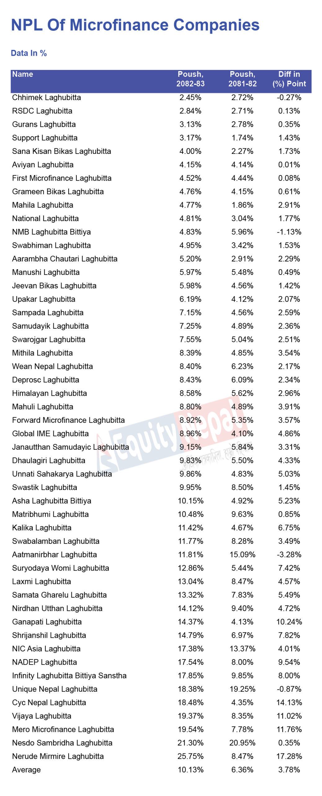 ५० लघुवित्तमध्ये छिमेक लघुवित्तको निष्क्रिय कर्जा दर (एनपीएल) सबैभन्दा कम २.४५ प्रतिशत छ । आरएसडीसीको २.८४ प्रतिशत, गुराँसको ३.१३ प्रतिशत र सपोर्ट लघुवित्तको ३.१७ प्रतिशत एनपीएल छ । यता, नेरुडे मिर्मिरेको २५.७५ प्रतिशत छ ।