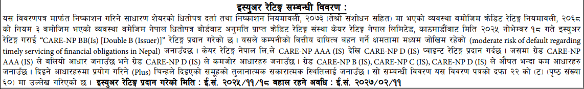 यो निष्कासन बन्द छिटोमा फागुन ११ गते हुनेछ भने ढिलोमा फागुन १९ गते हुनेछ । कम्पनीको सेयर निष्कासन तथा बिक्री प्रबन्धक ग्लोबल आइएमई क्यापिटल लिमिटेड रहेको छ । लगानीकर्ताले नेपाल धितोपत्र बोर्डबाट स्वीकृति प्राप्त गरेका सम्पूर्ण सि आस्बा सदस्य बैंक तथा वित्तीय संस्थाहरु र तिनका तोकिएका शाखा कार्यालयहरुबाट सि आस्बा प्रणाली मार्फत आवेदन दिन सक्नेछन् ।