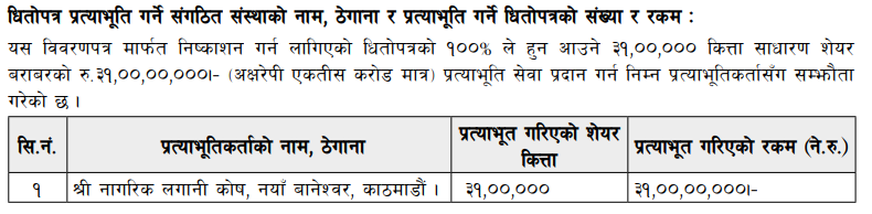 यता, १ लाख ५५ हजार कित्ता सेयर नेपाल सरकारको सम्बन्धित निकायबाट श्रम स्वीकृति प्राप्त गरी वैदेशिक रोजगारीमा रहेका नेपाली नागरिकहरुका लागि बाँडफाँट गरिएको छ । ७७ हजार ५०० कित्ता सेयर सामूहिक लगानी कोषहरुलाई र ३१ हजार कित्ता कर्मचारीलाई छुट्याएपछि बाँकी रहेको १२ लाख ८६ हजार ५०० कित्ता सेयर आम सर्वसाधारणलाई बिक्री खुला गरिएको हो ।