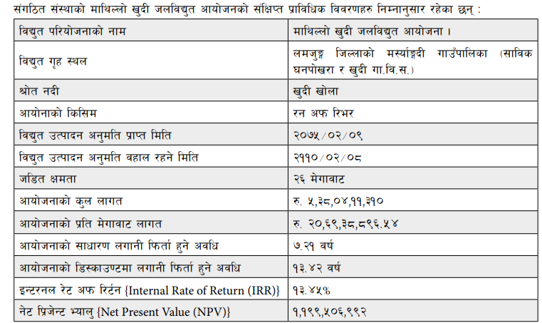 यस कम्पनीले माथिल्लो खुदी जलविद्युत आयोजना उत्पादन तथा सञ्चालन गर्न विद्युत उत्पादनको अनुमतिपत्र २११० जेठ ०८ गतेसम्म बहाल रहेको छ । कम्पनीले पहिचान गरी विकास निर्माण प्रारम्भ गरेको लमजुङ्ग जिल्लाको मर्स्याङ्गदी गाउँपालिका वडा नं. २ र ३ अन्तर्गत माथिल्लो खुदी जलविद्युत आयोजनाको ८२.३० प्रतिशत कार्य सम्पन्न भइसकेको छ ।