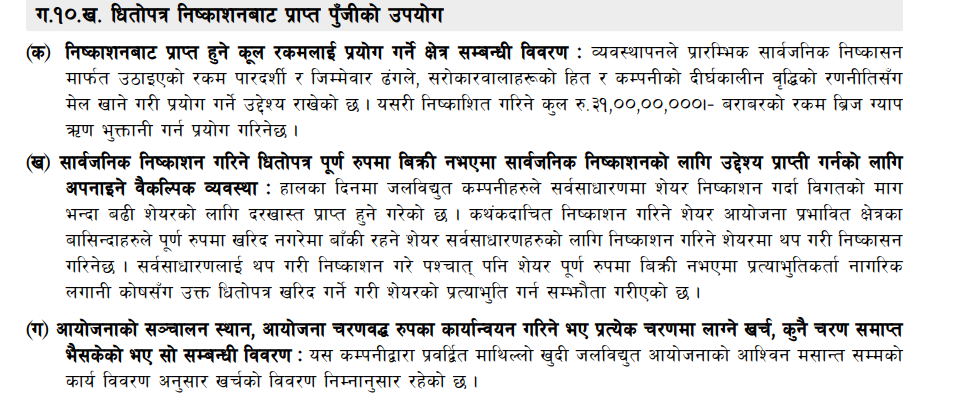 साथै, संकलित पुँजीलाई परिचालन गर्दै निर्माणाधिन अवस्थामा रहेको माथिल्लो खुदी जलविद्युत आयोजनाको निर्माण गरी जलविद्युत उत्पादन गर्ने उद्देश्यले सेयर जारी गर्न लागेको कम्पनीले जनाएको छ । आइपीओ बिक्रीबाट प्राप्त हुने ३१ करोड बराबरको रकम ब्रिज ग्याप ऋण भुक्तानी गर्न प्रयोग गरिनेछ ।