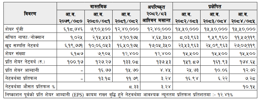 गत आर्थिक वर्षमा कम्पनीले १९ करोड ४६ लाख रुपैयाँ नाफा कमाएको छ । कम्पनीले आर्थिक वर्ष २०८२-८३ को अन्त्यसम्ममा ३९ करोड ८७ लाख रुपैयाँ नाफा कमाउने प्रक्षेपण गरेको छ । त्यस्तै, २०८३—८४ मा १५ करोड ५९ लाख रुपैयाँ नाफा कमाउने प्रक्षेपण गरेको छ । चालु आर्थिक वर्षको पहिलो त्रैमाससम्म कम्पनीको सञ्चित नाफा ४६ करोड ५३ लाख रुपैयाँ छ । प्रतिसेयर नेटवर्थ १३७.५३ रुपैयाँ छ ।