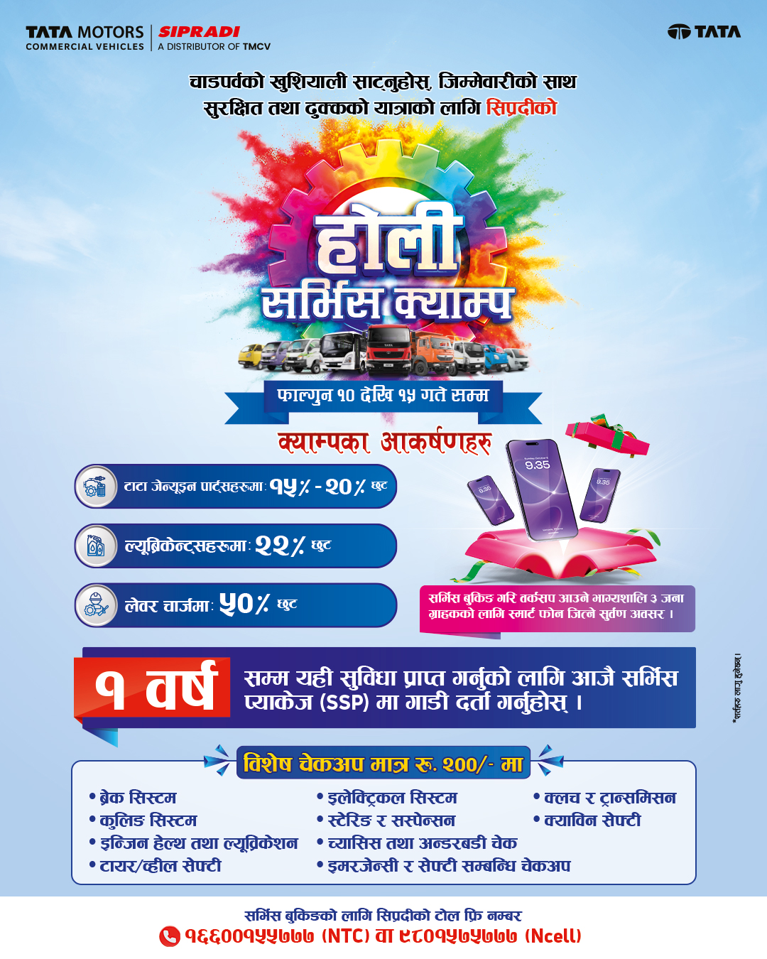 काठमाडौं । नेपालीहरूको महान पर्व होली नजिकिँदै गर्दा यातायातको साधन प्रयोग बढ्ने भएकाले टाटा कमर्शियलले आफ्नो ग्राहकका लागि होली सर्भिस क्याम्पको आयोजना गरेको छ। फागुन १० देखि १५ गतेसम्म सञ्चालन हुने उक्त क्याम्प सिप्रदीका २० वटा सर्भिस सेन्टरमा एकैसाथ संचालन हुनेछ। ग्राहकका गाडीहरूको सुरक्षित यात्रा सुनिश्चित गर्न ब्रेक सिस्टम, कुलिङ सिस्टम, इन्जिन हेल्थ, टायर, इलेक्ट्रिकल सिस्टम, स्टेरिङ र सस्पेन्सन, क्लच र ट्रान्समिसन, क्याबिन सेफ्टी, च्यासिस र अन्डरबडी चेक, इमरजेन्सी र सेफ्टी गरी १० बुँदे चेकअप सुविधा प्रदान गरिनेछ।