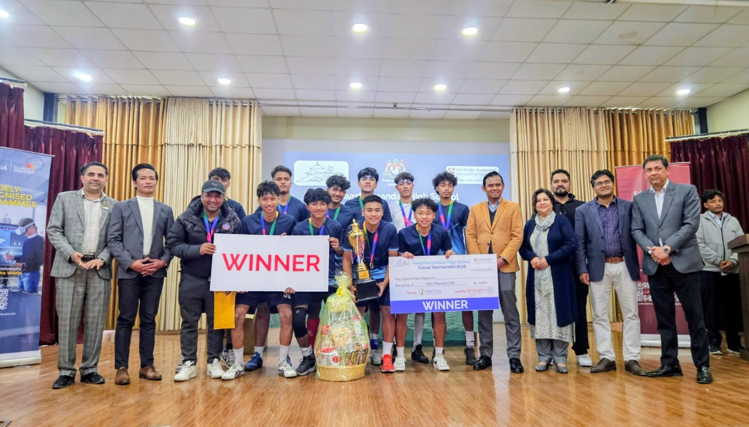 विजेतालाई नेपालस्थित मलेसिया दूतावासका प्रतिनिधि मोहम्मद फिरदाउस अज्मान, स्टडी प्लसका संस्थापक निर्देशक उमेश अधिकारी, काष्ठमण्डपकी संस्थापक प्रिन्सिपल डा. शिवा थापालगायतले एक कार्यक्रमबीच पुरस्कृत गरे । भक्तवीर सिंह तुलाधर फाउन्डेसनको मुख्य प्रायोजन तथा स्टडी प्लसको सहयोगमा भएको दुईदिने प्रतियोगितामा आयोजकको २ सहित ८ टिमले लिग कम नकआउट आधारमा प्रतिस्पर्धा गरेका थिए ।