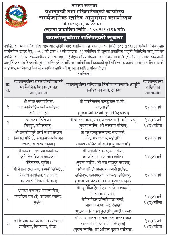 काठमाडौं । प्रधानमन्त्री तथा मन्त्रिपरिषद्को कार्यालय मातहत रहेको सार्वजनिक खरिद अनुगमन कार्यालयले सातवटा निर्माण कम्पनीलाई कालोसूचीमा राखेको छ।
