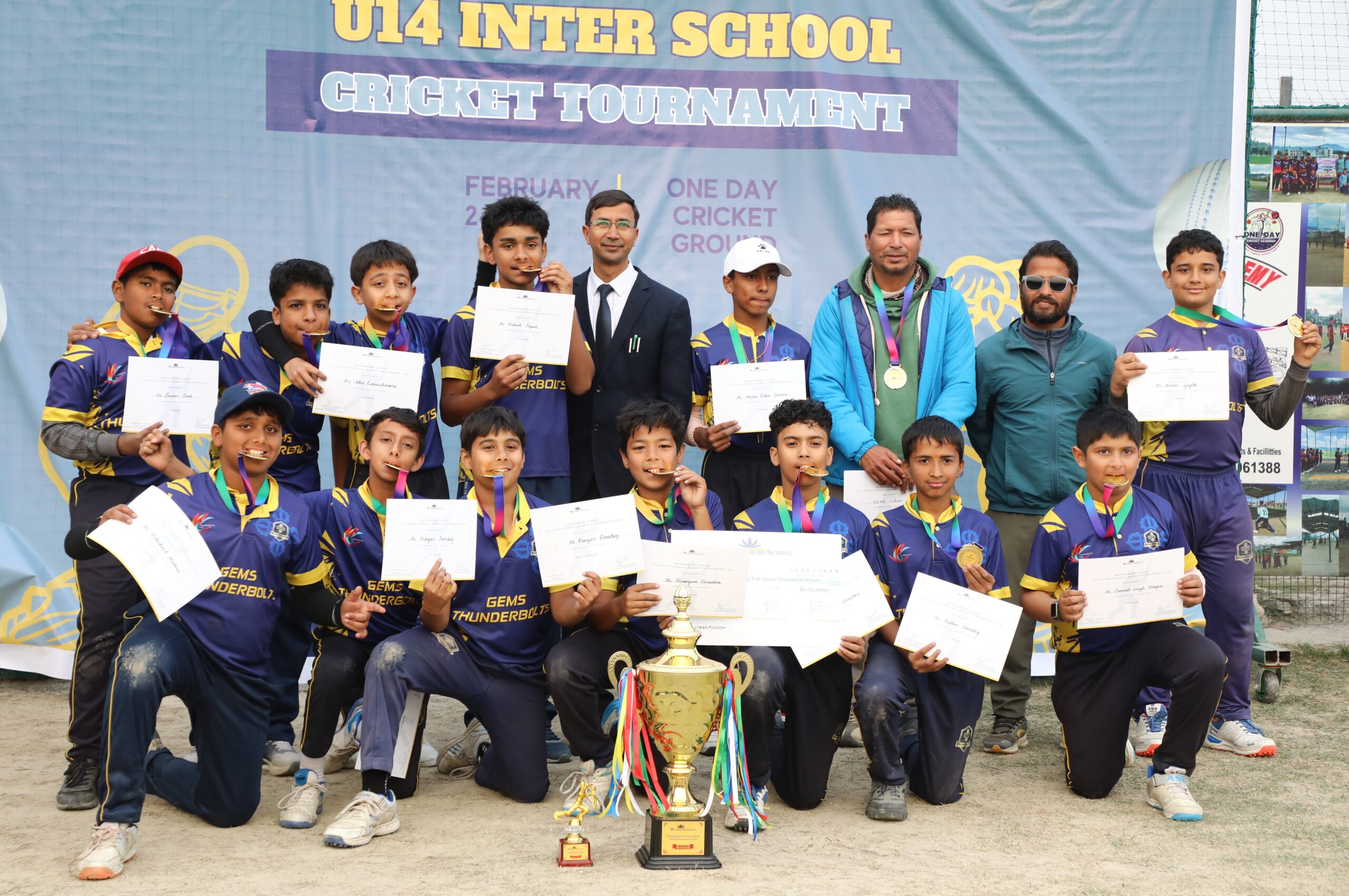 उपाधिसंगै जेम्सले ५० हजार नगद पुरस्कार हात पार्यो भने उपविजेता अक्षराले २५ हजार नगद पुरस्कार पायो । अक्षराका रिजेन बस्नेत ‘प्लेयर अफ द टुर्नामेन्ट’ घोषित भए । उनले माउन्टेन बाइक पुरस्कार पाए । ग्यालेक्सीका मिङमा तामाङ उत्कृष्ट ब्याट्सम्यान चुनिए । उनले ब्याट उपहार पाए । उत्कृष्ट बलर बनेका जेम्सका प्रागभ पाण्डेले जुत्ता पुरस्कार हात पारे । विजेतालाई मातृभूमिका को–ओर्डिनेटर जयराम अधिकारीलगायतले एक कार्यक्रमबीच पुरस्कृत गरे । तीनदिने प्रतियोगितामा ८ छात्र टिमले लिग कम नकआउट आधारमा प्रतिस्पर्धा गरेका थिए ।