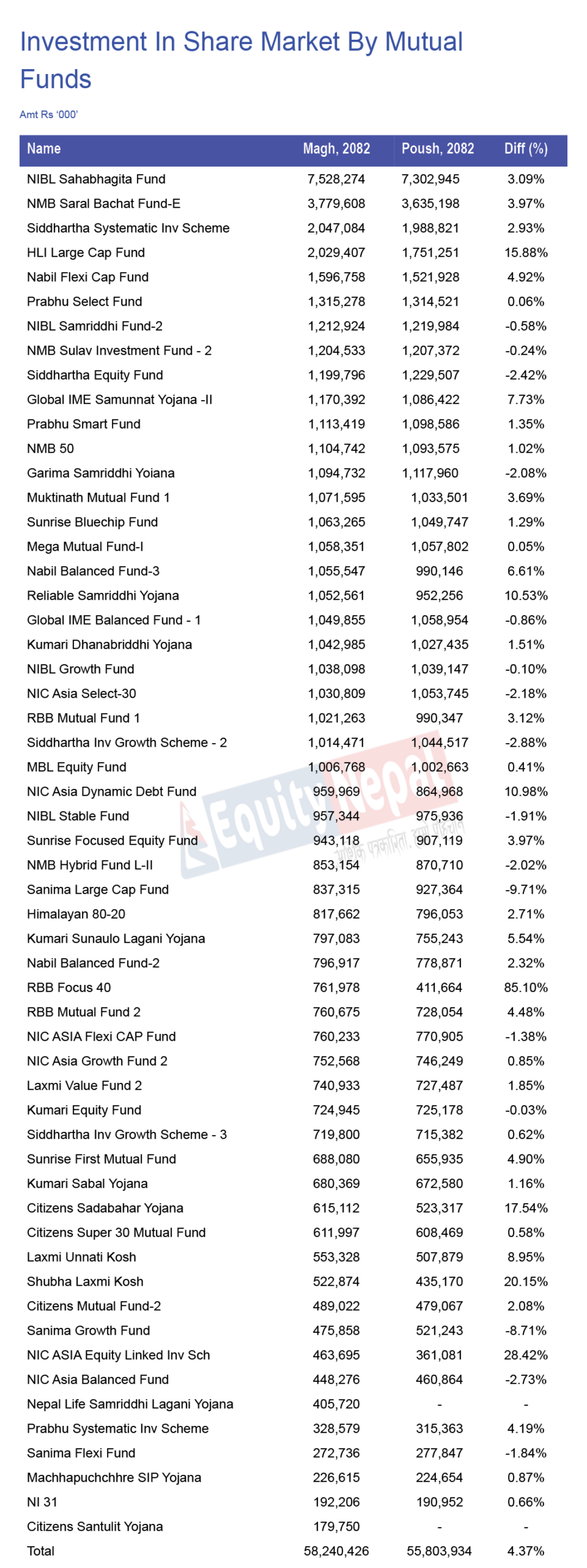 काठमाडौं । सञ्चालनमा रहेका म्युचुअल फन्डहरुले सेयर बजारमा ५८ अर्ब भन्दा धेरै लगानी गरेका छन् । चालु आर्थिक वर्षको माघ महिनासम्म आइपुग्दा ५६ वटा फन्डहरुले सेयर बजारमा ५८ अर्ब २४ करोड रुपैयाँ लगानी गरेका छन् । यो अघिल्लो महिनाको भन्दा ४.३७ प्रतिशत धेरै हो । अघिल्लो महिना अर्थात, पुसमा फन्डहरुको सेयर बजारमा ५५ अर्ब ८० करोड रुपैयाँ लगानी थियो ।