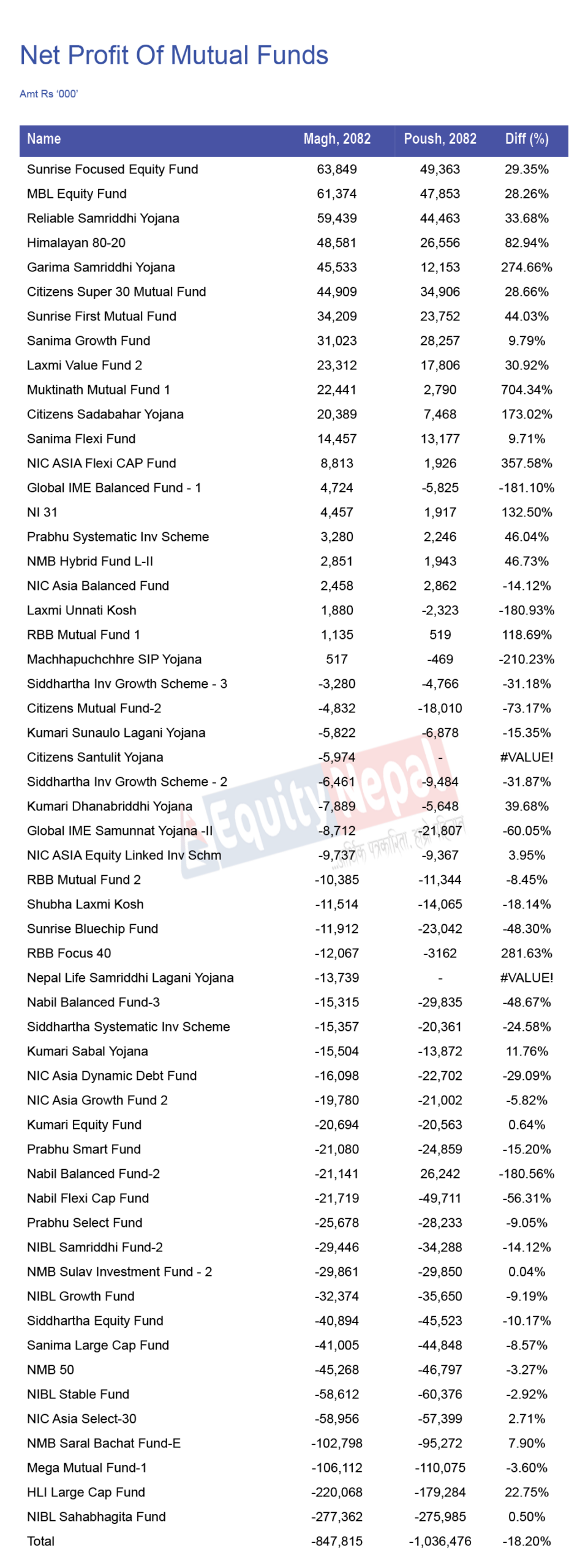 सनराइज फोकस्ट इक्विटी फन्डले ६ करोड ३८ लाख रुपैयाँ नाफा कमाएको छ । एमबीएल इक्विटीले ६ करोड १३ लाख, रिलायबल समृद्धि योजना ५ करोड ९४ लाख रुपैयाँ नाफा कमाएको छ ।