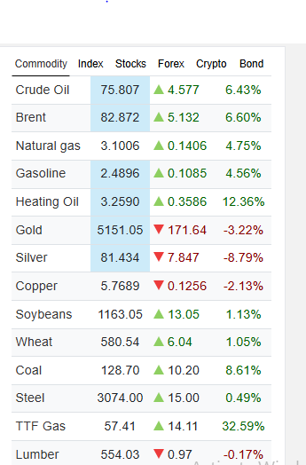 बजार तथ्यांकअनुसार कच्चा तेल र ब्रेन्ट तेल दुवै ६ प्रतिशतभन्दा बढीले उकालो लागेका छन्। प्राकृतिक ग्यास, पेट्रोल र हिटिङ आयलमा पनि उल्लेखनीय वृद्धि देखिएको छ। टीटीएफमा दोहोरो अंकको उछाल आएको छ। ऊर्जा आपूर्ति अवरुद्ध हुन सक्ने जोखिम बढेपछि लगानीकर्ताहरूले ठूलो मात्रामा खरिद बढाएका कारण मूल्य चढेको विश्लेषण गरिएको छ।