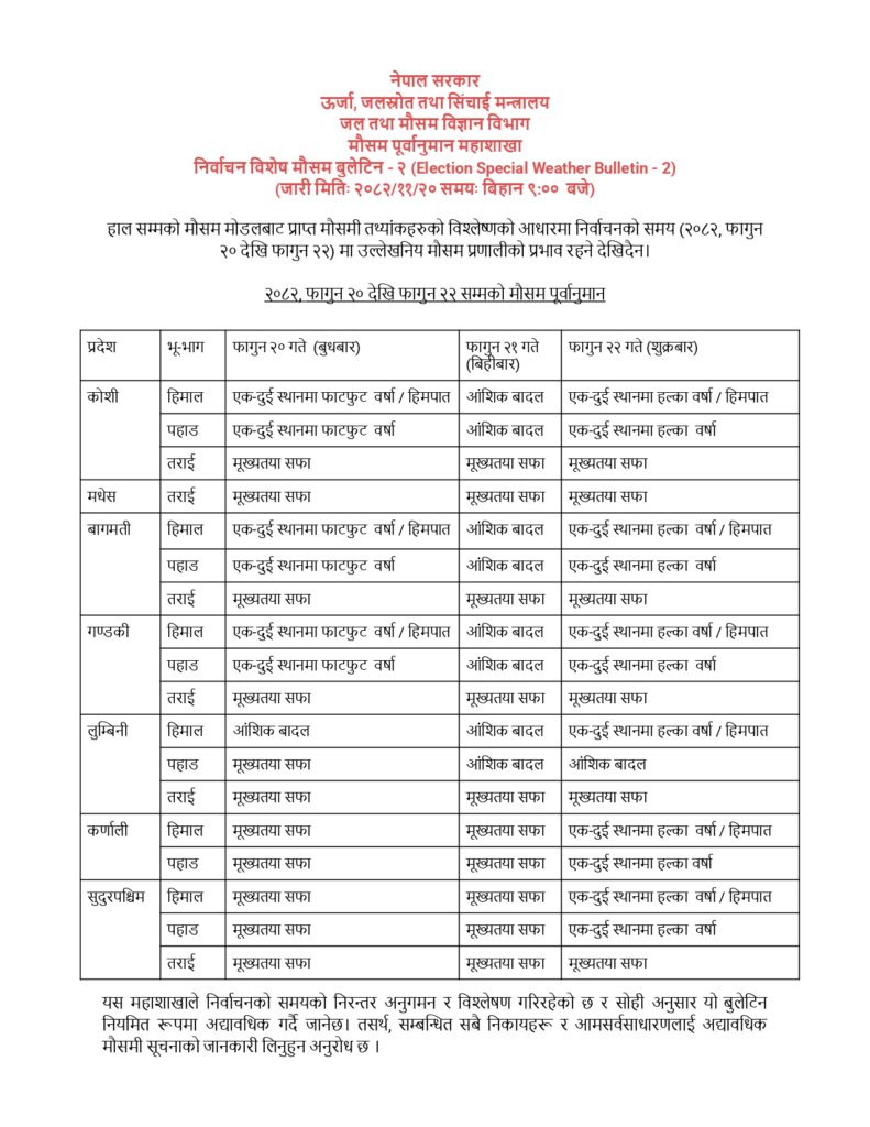 विभागका अनुसार निर्वाचनको दिन पानी पर्ने सम्भावना छैन । मतदानको दिन मौसम राम्रो नै रहन्छ । यद्यपि वागमती, गण्डकी र कोशी प्रदेशका पहाडी भू–भागहरुमा आशिंक बादल लाग्नसक्ने देखिन्छ । र बादलसँगै तुवाँलो पनि छ यसमा किनभने वर्षा नभएको लामो समय भयो । त्यो तुवाँलो पनि थुप्रिएको छ । त्यसकारण निर्वाचन प्रभावित हुनेगरी वर्षा, भारी वर्षा वा हिमपात त्यस्तो केही सम्भावना छैन । मतदानको दिन राम्रै मौसम हुने देखिन्छ । निर्वाचनको दिनको हकमा सबैतिरको मौसम सफा नै छ । आजको जस्तै बादल लाग्नेजस्तो बदली हुनसक्छ । त्यस्तो बदली भयो भने आत्तिहाल्नु हुदैन । केही ठाउँमा हावा चल्ने हुनसक्छ । त्यसको लागि बुथहरुमा टेन्टहरु अलि बलियो गरी बाध्ने हुनसक्छ । त्यसबाहेक वर्षा हुने र हिमपात हुने कुनै सम्भावना छैन । मौसम सफा नै रहनेछ ।