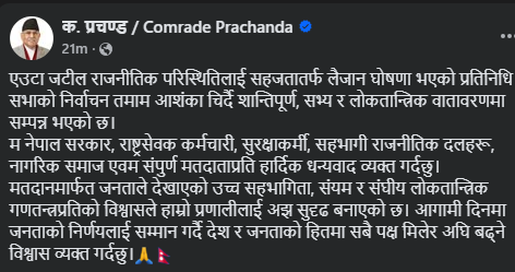 उनले सामाजिक सञ्जाल फेसबुकमा भनेका छन्,‘म नेपाल सरकार, राष्ट्रसेवक कर्मचारी, सुरक्षाकर्मी,सहभागी राजनीतिक दलहरू नागरिक समाज एवम संपुर्ण मतदाताहरु प्रति हार्दिक धन्यवाद व्यक्त गर्दछु।’
