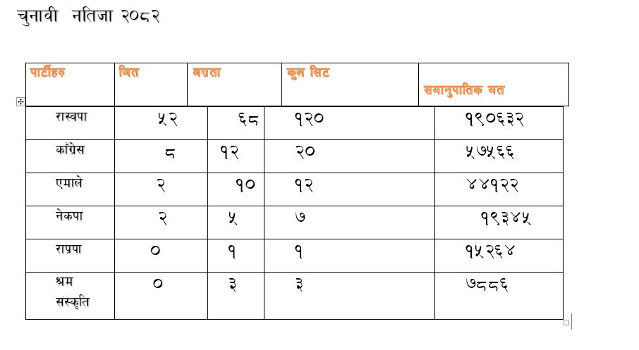 नेकपाका नरेन्द्रप्रसाद पाण्डेले ६०३३ मत ल्याउँदा राप्रपाका ३२३४ मत, प्रलोपाकी कृष्णा केसीले १२४० मत ल्याएकी छन् ।