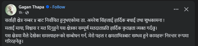 काठमाडौं । गगन थापाले डा. अमरेश कुमार सिंहलाई सर्लाही जिल्ला क्षेत्र नम्बर ४ बाट निर्वाचित भएकोमा बधाई तथा शुभकामना दिएका छन्। सामाजिक सञ्जालमार्फत थापाले, “मलाई माया, विश्वास र मत दिनुहुने यस क्षेत्रका सम्पूर्ण मतदाताप्रति हार्दिक कृतज्ञता व्यक्त गर्दछु।यस क्षेत्रमा मैले देखेका समस्याहरूको सम्बोधन गर्न, मेरो पहल र क्षमताभित्रबाट सम्भव हुने कामहरू निरन्तर रूपमा गरिरहनेछु”, लेखेका छन् ।