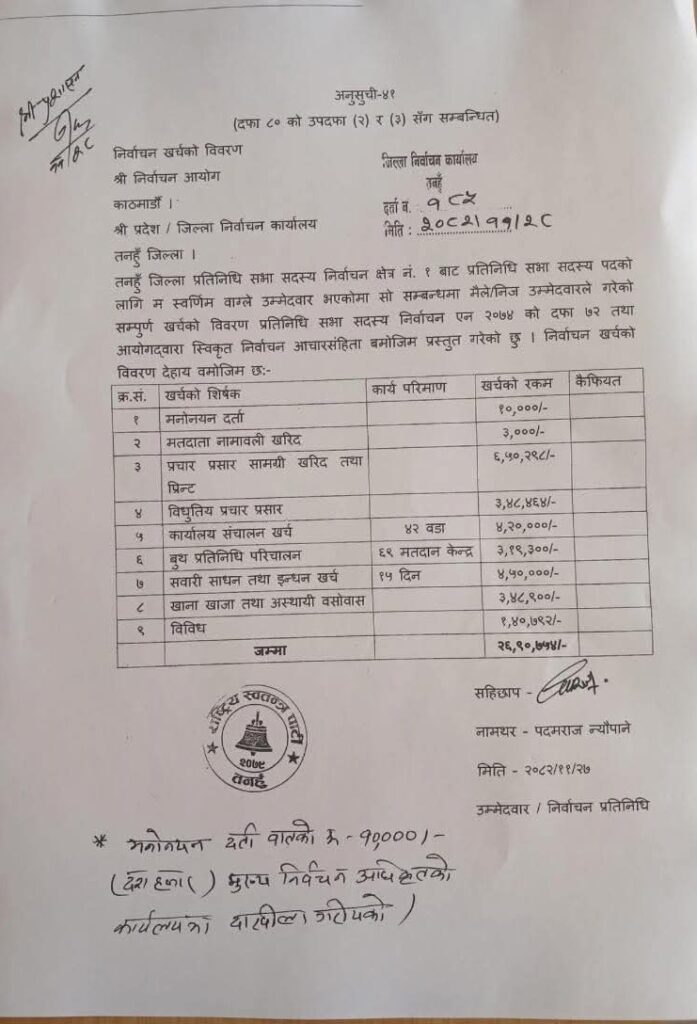 उनको प्रचार प्रसार सामग्री खरिद तथा प्रिन्टको लागि सबैभन्दा बढि ६ लाख ५० हजार २९८ रुपैयाँ खर्च भएको देखिएको छ । त्यसैगरी विद्युतिय प्रचार प्रसार ३ लाख ४८ हजार ४६४ रुपैयाँ,खाना खाजा तथा अस्थायी बसोवास ३ लाख ४८ हजार ९०० रुपैयाँ खर्च भएको छ ।