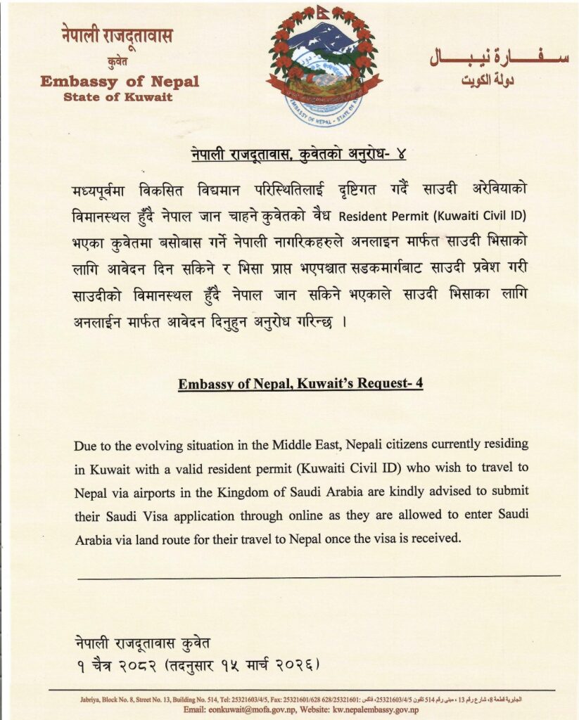 काठमाडौं । कुवेतस्थित नेपाली दूतावासले नेपाल फर्किन चाहने कुवेतमा रहेका नेपालीलाई साउदी अरब हुँदै फर्किन अनुरोध गरेको छ । दूतावासले आज विज्ञप्तिमार्फत अनुरोध गर्दै मध्यपूर्वमा विकसित विद्यमान परिस्थितिलाई दृष्टिगत गर्दै साउदी अरेबियाको विमानस्थल हुँदै नेपाल जान चाहने कुवेतमा बसोबास गर्ने नेपालीलाई ‘अनलाइन’ मार्फत साउदी भिसाका लागि आवेदन दिन सकिने जनाएको हो ।