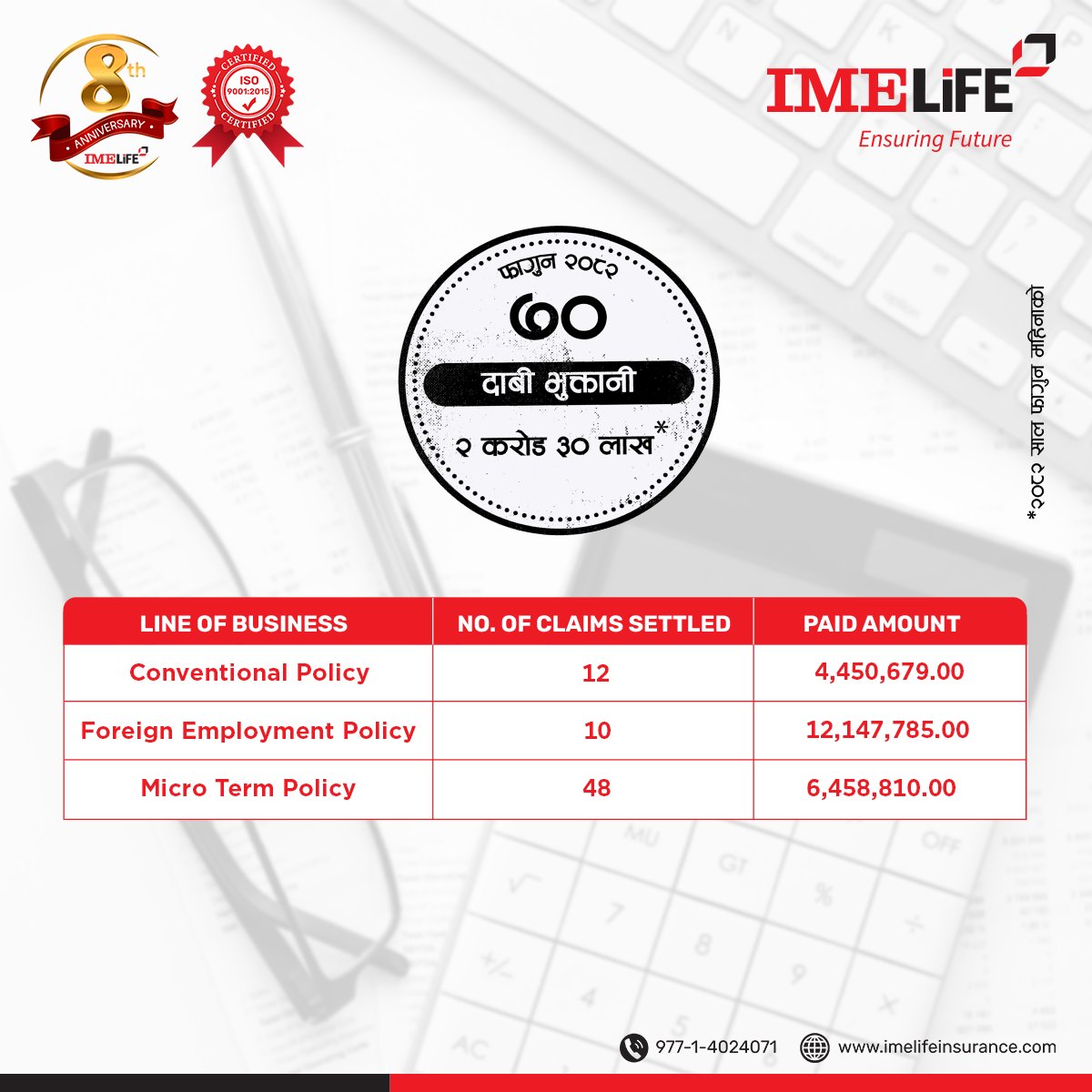 आइएमई लाइफद्वारा फागुनमा २ करोड बढीकाे बीमा दावी भुक्तानी
