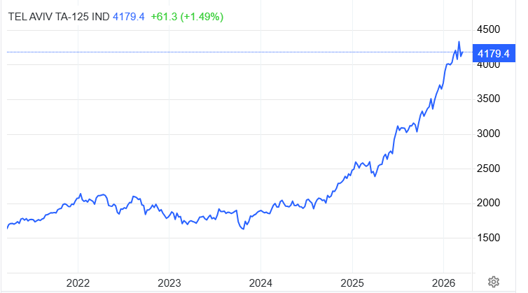 स्टक एक्सचेन्जको मुख्य सूचकांक ‘टीए-१२५’ करिब ४ हजार १०० अंकमा पुगेको छ, जुन अघिल्लो वर्षको तुलनामा करिब ६४ प्रतिशतले वृद्धि भएको हो । अर्को सूचकाकं टीए ३५ पनि १ वर्षमा ६८ प्रतिशत बढेको छ । सूचकहरु हालसम्म कै उच्च विन्दुको आसपासमा छन् । यससँगै इजरायली मुद्रा शेकेल पनि अमेरिकी डलरको तुलनामा मजबुत बनेको छ ।