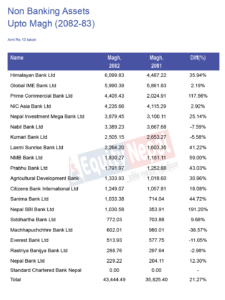 त्यसैगरी, नेपाल एसबिआई बैंक र प्राइम कमर्सियल बैंकको गैर-बैंकिङ सम्पत्ति १०० प्रतिशतभन्दा बढीले बढेको छ।