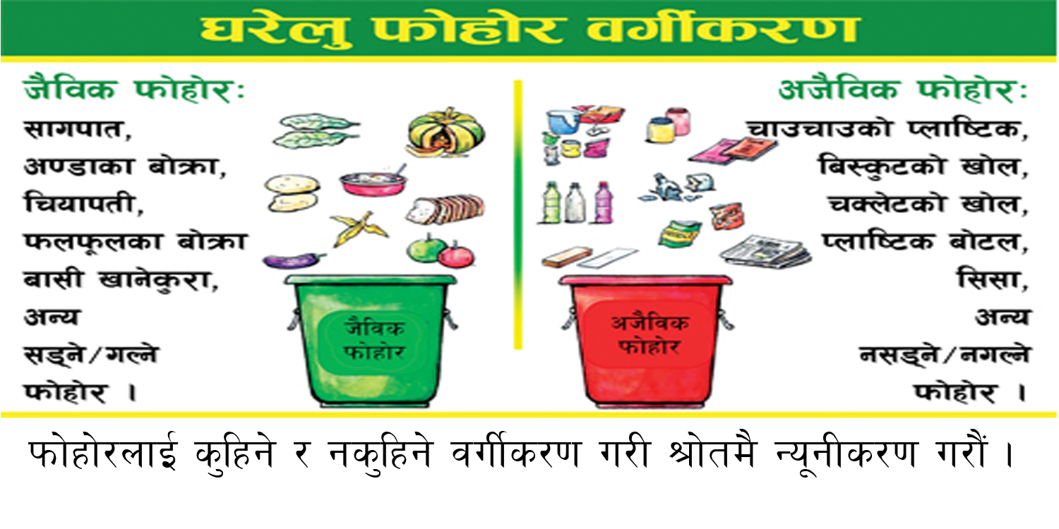 नगरपालिकाले कुहिने जैविक फोहोरः घरेलु फोहोरमैला (खाना पकाउँदा बाँकी रहेका अवशेष, भात, दाल, तरकारी तथा फलफूलका बोक्रा, सागसब्जी, पातिङ्गर, घाँस, चिया तथा कफीका अवशेष आदि कुहिने फोहोर) जस्ता सडिगली जाने प्रकृतिका घरायसी वस्तुहरु, नकुहिने (अजैविक) फोहोरः प्लाष्टिक, पोलिथिन, रबर, कपडा, जुत्ता, ब्याट्री, विद्युतीय सामानहरुका अवशेष जस्ता सडिगली नजाने प्रकृतिका फोहोरहरु तथा नकुहिने (अजैविक) फोहोरः सिसा, काँच, धातु, टिनलगायत सडिगली नजाने प्रकृतिका कवाडहरु वर्गीकरण गर्न अनुरोध गरेको छ ।