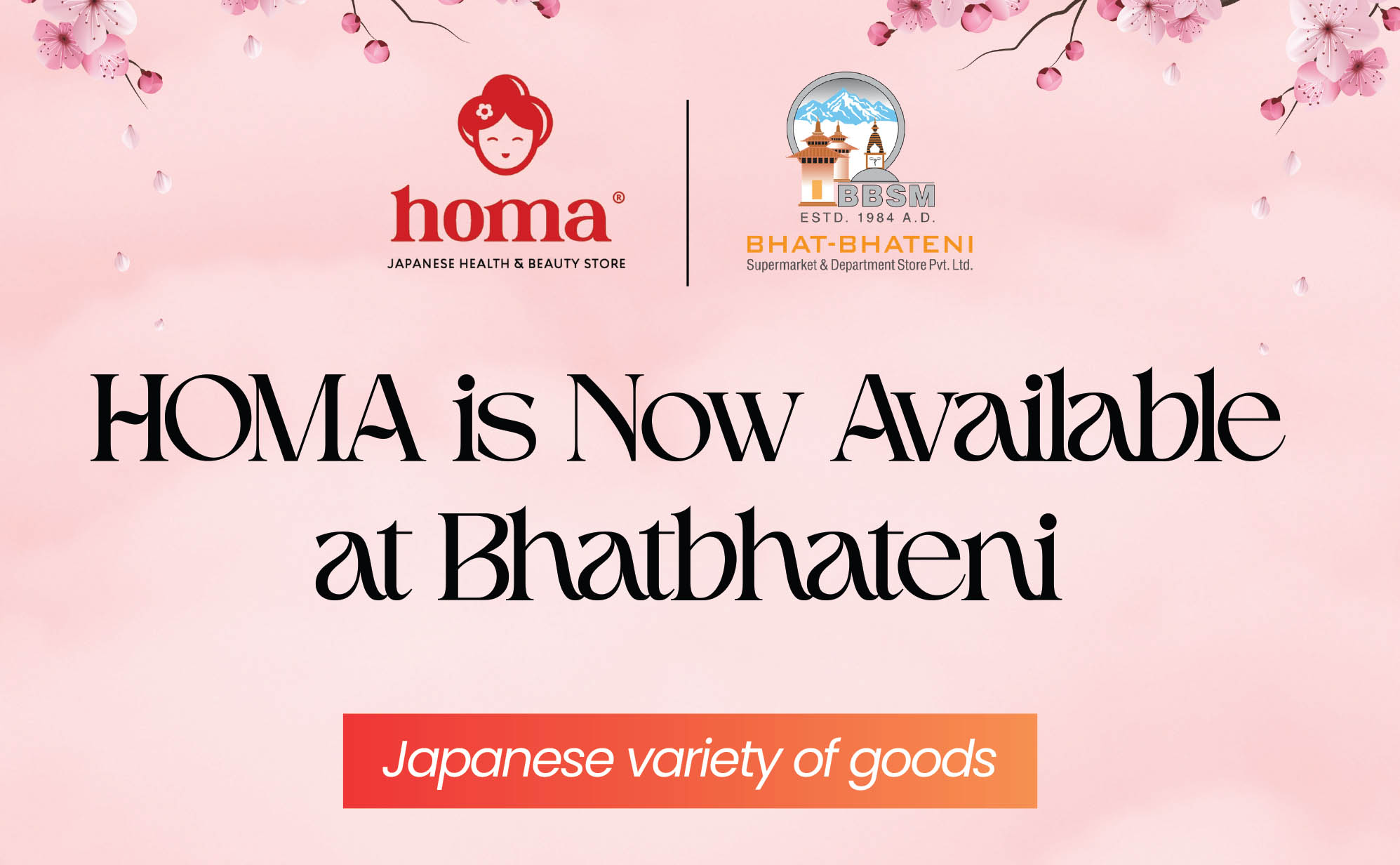 अबदेखी जापानी स्किन केयर तथा कस्मेटिक आयातकर्ता होमा द्वारा नेपाली बजारमा आयात तथा बिक्री वितरण गरिने सम्पूर्ण उत्पादनहरु भाटभटेनी सुपरमार्केटमा उपलब्ध हुने भएका हुन् । होक्काईदो विजनेस ग्रुप नेपाल अन्तर्गतको होमाले सन् २०२३ देखी आधिकारीक रुपमा जापानी कस्मेटीक, स्किन केयर तथा हेल्थ केयर प्रोडक्टस्हरु नेपाली बजारमा भित्र्याएको हो ।