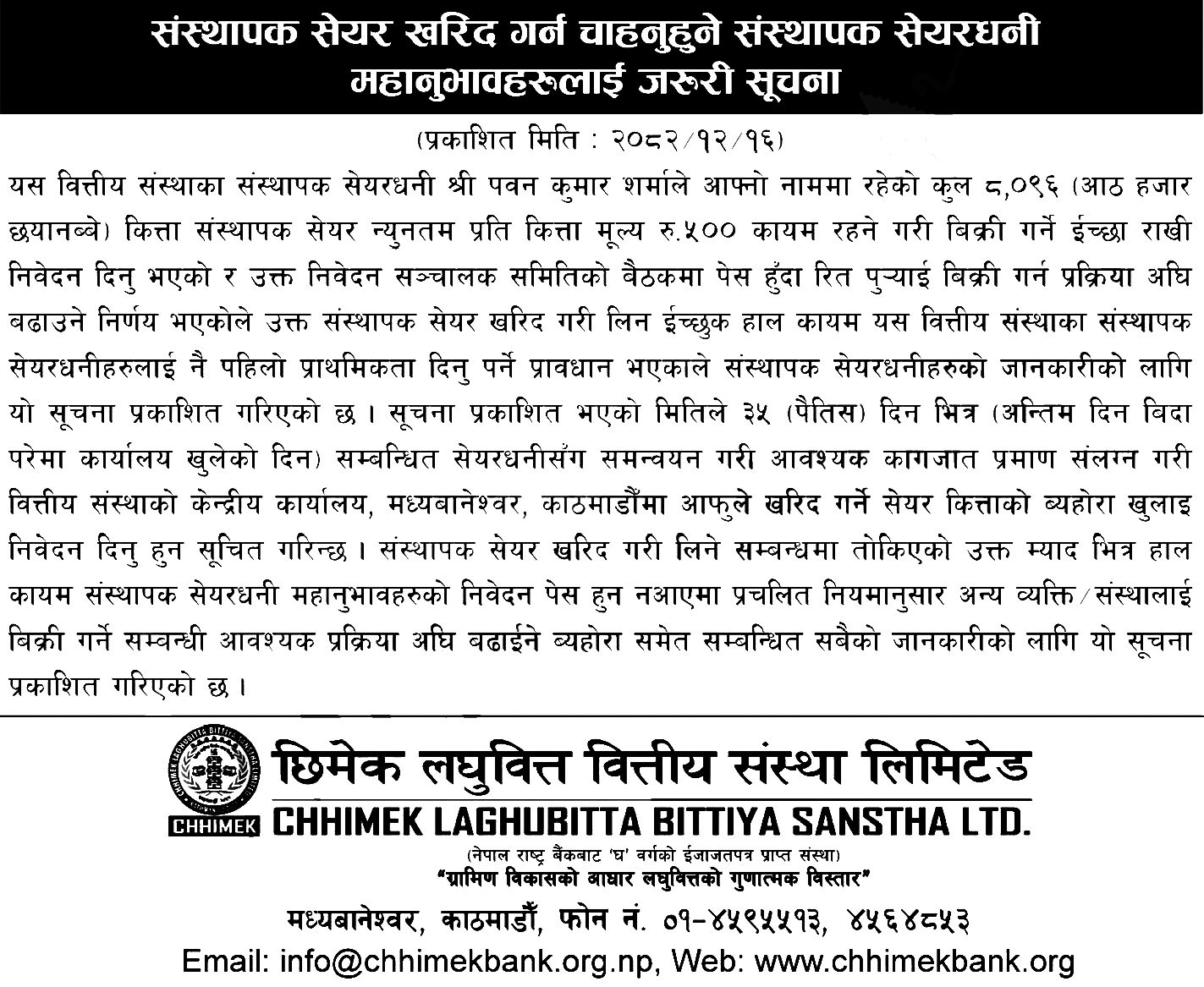 काठमाडौं । छिमेक लघुवित्त वित्तीय संस्था लिमिटेडले संस्थापक सेयर बिक्रीमा राखेको छ । कम्पनीले संस्थापक सेयरधनी पवन कुमार शर्माको नाममा रहेको ८ हजार ९६ कित्ता संस्थापक सेयर बिक्रीमा राखेको हो ।