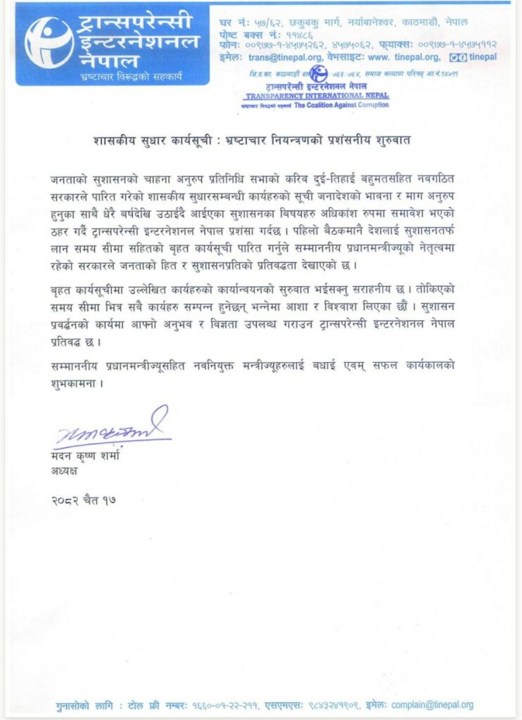 ‘ जनताको सुशासनको चाहना अनुरुप प्रतिनिधि सभाको करिव दुई तिहाई बहुमतसहित नवगठित सरकारले पारित गरेको शासकीय सुधारसम्बन्धी कार्यहरुको सूची जनादेशको भावना र माग अनुरुप हुनुका साथै धेरै बर्षदेखि उठाईदै आईएका सुशासनका बिषयहरु अधिकांश रुपमा समावेश भएको ठहर गर्दै ट्रान्सपरेन्सी इन्टरनेशनल नेपाल प्रशंसा गर्दछ । पहिलो बैठकमानै देशलाई सुशासनतर्फ लान समय सीमा सहितको बृहत कार्यसूची पारित गर्नुले सम्माननीय प्रधानमन्त्रीज्यूको नेतृत्वमा रहेको सरकारले जनताको हित र सुशासनप्रतिको प्रतिवद्धता देखाएको छ ।बृहत कार्यसूचीमा उल्लेखित कार्यहरुको कार्यान्वयनको सुरुवात भईसक्नु सराहनीय छ , ’ विज्ञप्तिमा भनिएको छ । ‘ तोकिएको समय सीमा भित्र सवै कार्यहरु सम्पन्न हुनेछन् भन्नेमा आशा र विश्वाश लिएका छौं । सुशासन प्रवर्द्धनको कार्यमा आफ्नो अनुभव र विज्ञता उपलब्ध गराउन ट्रान्सपरेन्सी इन्टरनेशनल नेपाल प्रतिवद्ध छ । सम्माननीय प्रधानमन्त्रीज्यूसहित नवनियुक्त मन्त्रीज्यूहरुलाई बधाई एवम् सफल कार्यकालको शुभकामना ’ , विज्ञप्तिमा भनिएको छ । शनिबार शाह नेतृत्वको नयाँ सरकारले शासकीय सुधारका लागि १०० वटा कार्यसूची सार्वजनिक गरेको थियो।