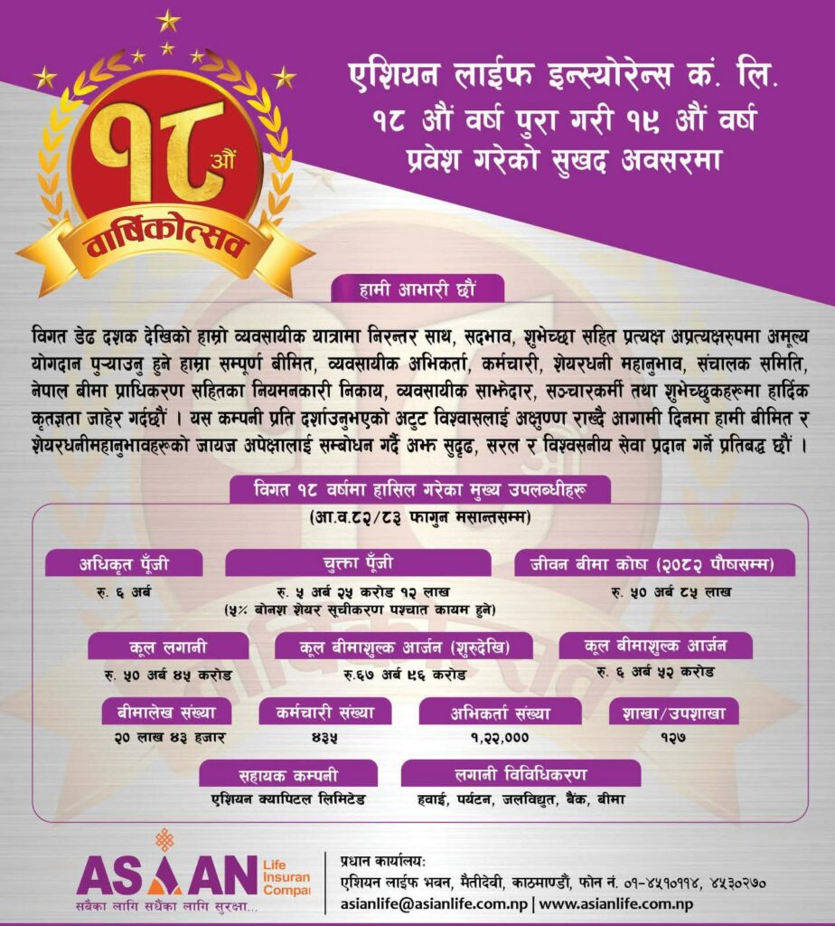 काठमाडौं । एशियन लाइफ इन्स्योरेन्स कम्पनीले आफ्नो स्थापनाको १९ औँ वर्षमा प्रवेश गरेको छ। डेढ दशकभन्दा लामो व्यवसायिक यात्रा तय गरेको कम्पनीले यस सुखद् अवसरमा आफ्ना बीमित, अभिकर्ता, कर्मचारी तथा सरोकारवालाहरुलाई धन्यवाद ज्ञापन गर्दै १८ वर्षका मुख्य उपलब्धि र वित्तीय विवरणहरु सार्वजनिक गरेको छ।