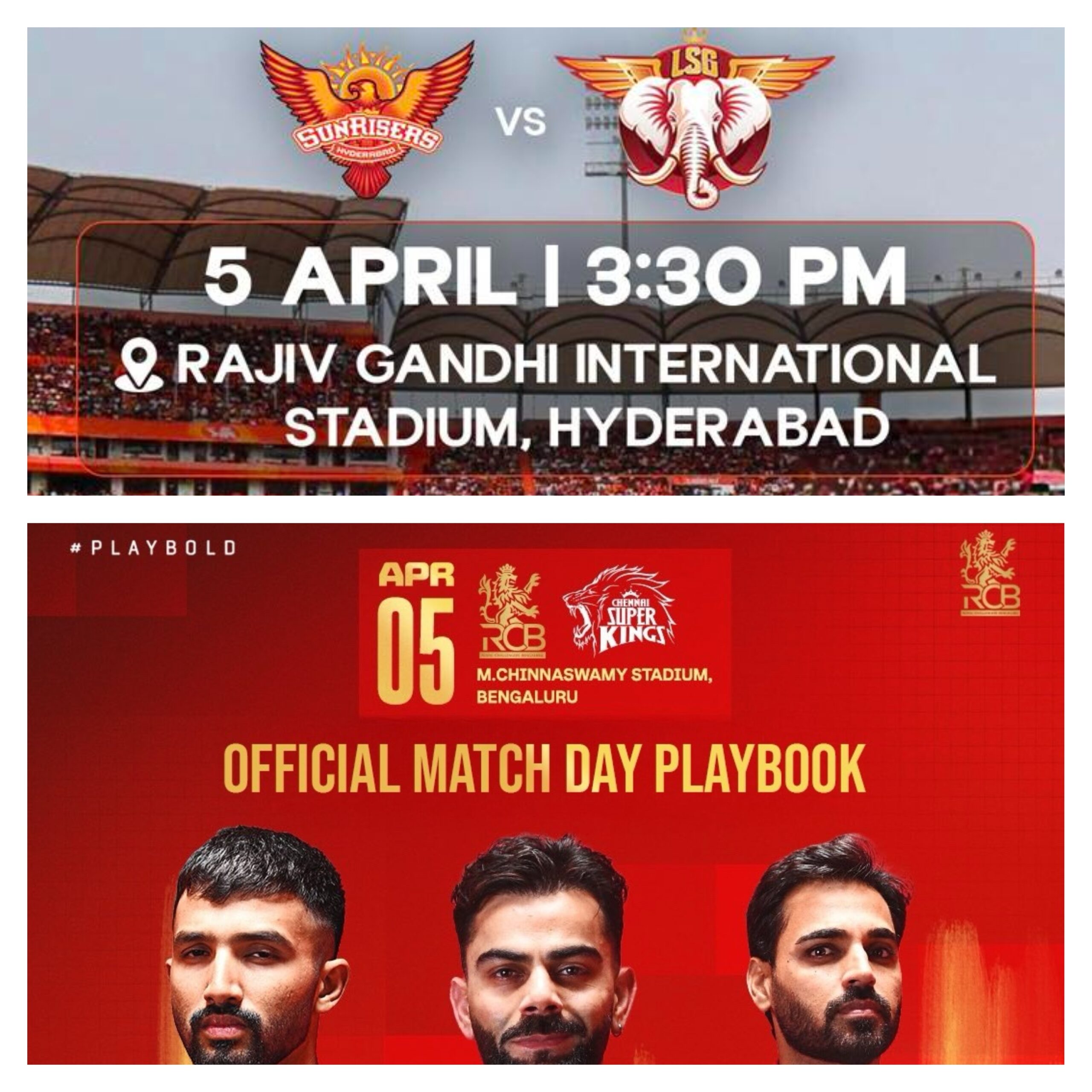 त्यस्तै, आजको दोस्रो खेल (म्याच ११) मा साविक विजेता रोयल च्यालेन्जर्स बेंगलुरु र पाँच पटकको च्याम्पियन चेन्नई सुपर किंग्स बीच प्रतिस्पर्धा हुनेछ । बेंगलुरुको एम. चिन्नास्वामी स्टेडियममा हुने यो खेल नेपाली समय अनुसार राती ८:०० बजे सुरु हुनेछ ।