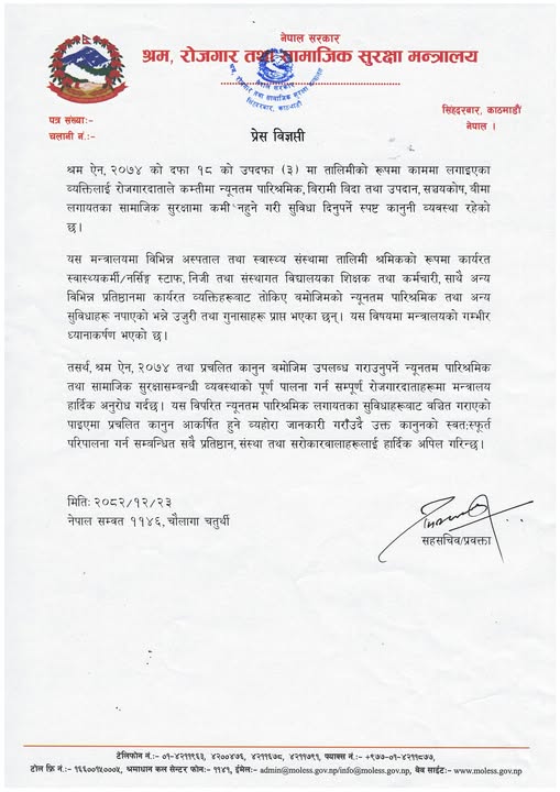 मन्त्रालयले आज एक प्रेस विज्ञप्ति जारी गर्दै विभिन्न अस्पताल तथा स्वास्थ्य संस्थामा कार्यरत स्वास्थ्यकर्मी, नर्सिङ स्टाफ, निजी तथा संस्थागत विद्यालयका शिक्षक तथा कर्मचारीलगायत विभिन्न प्रतिष्ठानमा कार्यरत श्रमिकले न्यूनतम पारिश्रमिक तथा अन्य सुविधा नपाएको भन्दै मन्त्रालयमा उजुरी तथा गुनासो आउने गरेको जनाएको छ ।