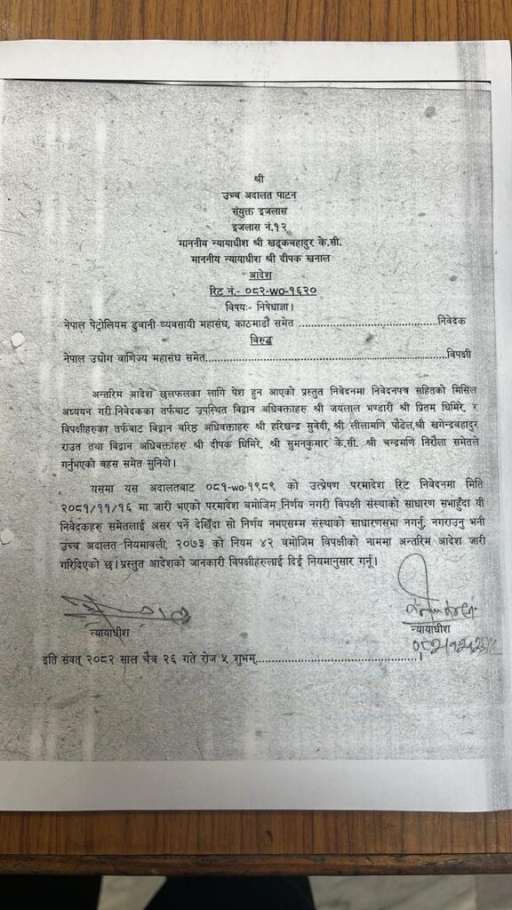 अदालतले नेपाल पेट्रोलियम ढुवानी व्यवसायी महासंघ, काठमाडौंले दायर गरेको रिटमा आदेश जारी गर्दै उक्त निर्देशन दिएको हो । पेट्रोलियम ढुवानी व्यवसायी महासंघले उद्योग वाणिज्इ महासंघलाई विपक्षी बनाई रिट दायर गरेको थियो ।