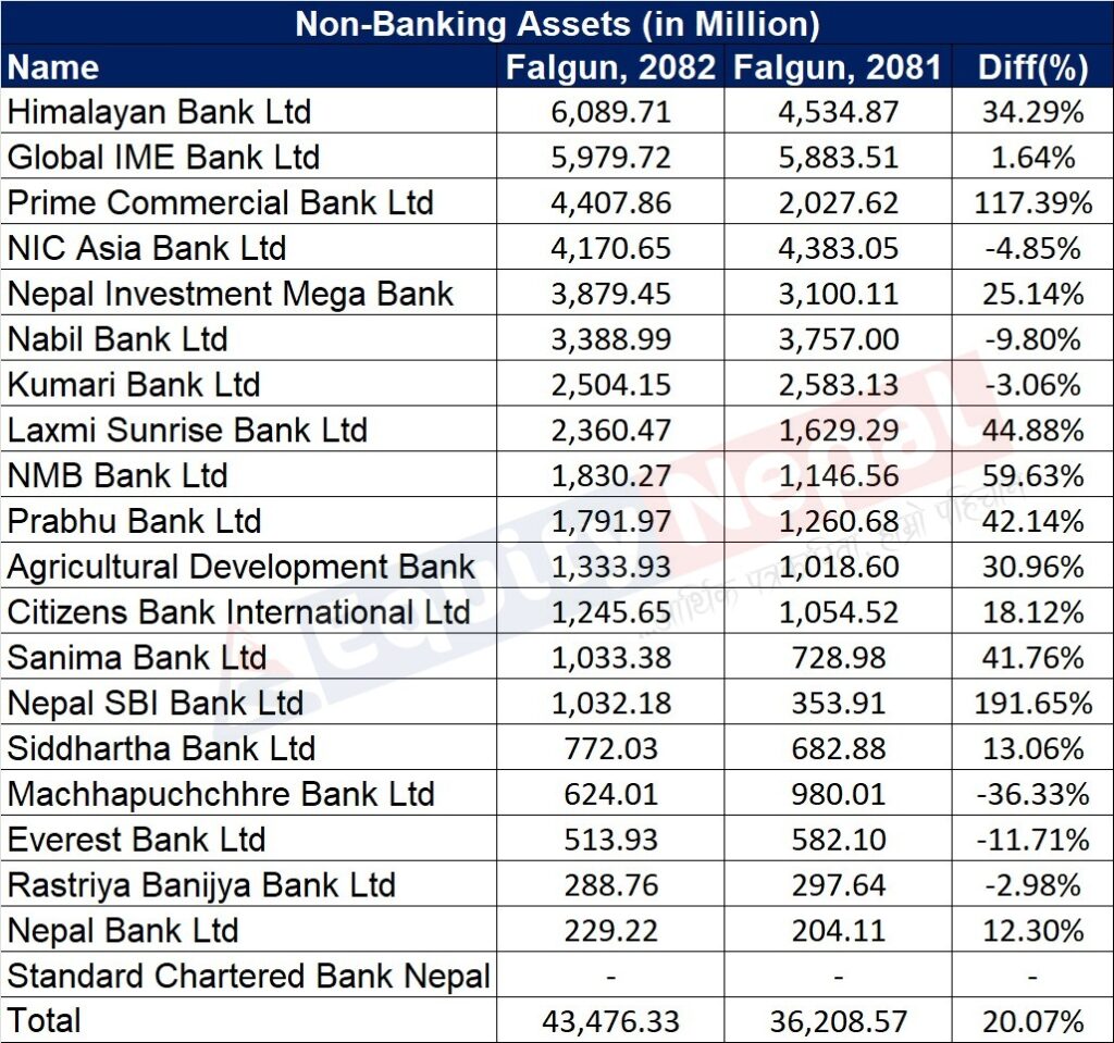 १९ वाणिज्य बैंक मध्य ६ बैंकको गैर बैकिङ सम्पति घटेको छ भने १३ वटा बैंकको बढेका छन् । चालु आवमा सबै भन्दा बढी गैर बैकिङ सम्पत्ती हिमालयान बैंक रहेको छ । बैंकको उकत सम्पत्ती ३४.२९ प्रतिशतले बढेर ६ अर्ब ८ करोड ९० लाख पुगेको छ । गत वर्ष ४ अर्ब ५३ करोड ४० लाख थियो ।