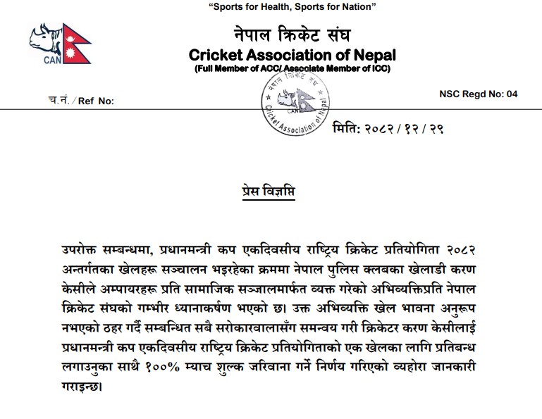 काठमाडौं । सामाजिक सञ्जालमार्फत ‘खेलाडीले अम्पायरलाई गल्तीले हिर्काए कति खेल प्रतिबन्ध हुन्छ?’ भनेर प्रश्न गरेका नेपाली राष्ट्रिय टोलीका पेसर करण केसीलाई एक खेलको प्रतिबन्ध लगाइएको छ।