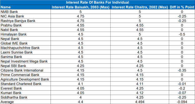 बैंकहरुले सार्वजनिक गरेको विवरण अनुसार धेरैजसो बैंकहरुले ब्याजदर यथावत राखेका छन् भने केही बैंकहरुले घटाएका छन् । १२ वटाले ब्याजदर यथावत राखेका छन् । सबैभन्दा बढी ब्याजदर कटौती हिमालयन बैंकले गरेको छ, जसले ५ प्रतिशतबाट घटाएर ४.५ प्रतिशत कायम गरेको छ ।