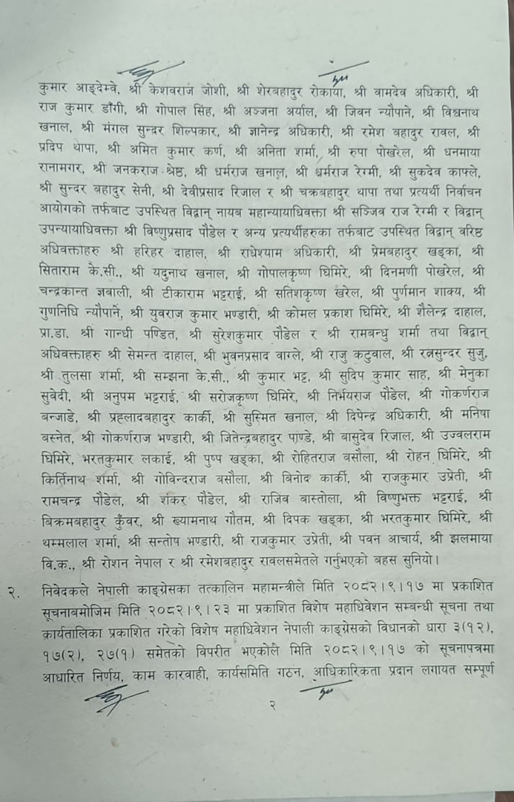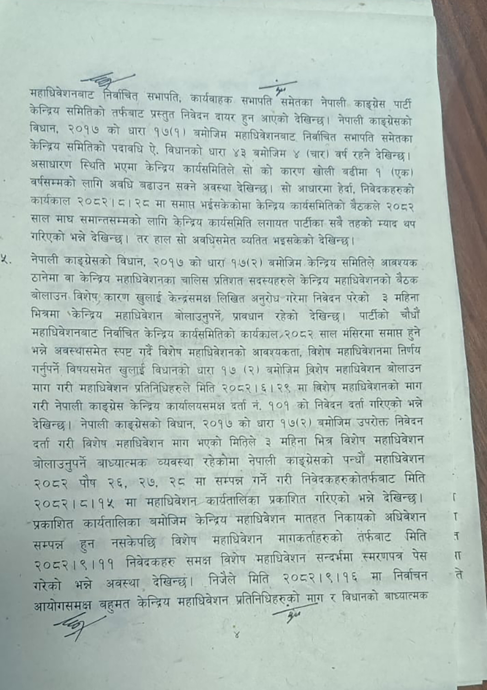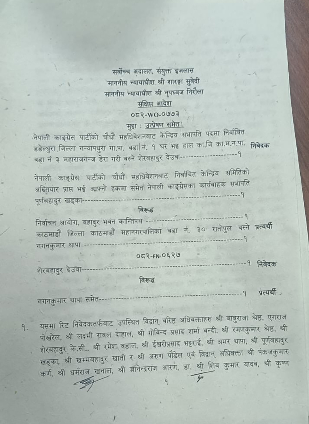 काठमाडौं । सर्वोच्च अदालतले गगन थापा नेतृत्वको कांग्रेसलाई आधिकारिकता प्रदान गरेको छ। योसँगैनेपाली कांग्रेसको आधिकारिकता कन विवाद टुंगिएको छ। सर्वोच्च अदालतमा विचाराधिन मुद्दामा आज अन्तिम सुनुवाई गरदै सर्वोच्चले विशेष महाधिवेशनबाट निर्वाचित नेतृत्वलाई आधिकारिकता दिएको हो।। न्यायाधीस न्यायाधीश द्वय शारडुना सुवेदी र निर्पधोज निरौलाको संयुक्तत इजलासले गगन कांग्रेसलाईलाई आधिकारिका दिएको हो। गगन नेतृत्वको कांग्रेसले गत मङ्सिर गत पुस अन्तिममा म विशेष महाधिवेश गर्दै कांग्रेसको नेतृत्व लिएका थिए । विशेष महाधिवेशन अवैधानिक भन्दै देउवा पक्ष निर्वाचन आयोगमा पुगेको थियो निर्वाचन आयोगले विशेषबाट निर्वाचित नेतृत्वलाई आधिकारिकता दिए पपश्त विषय अदालत प्रवेश गरेको थियो सर्वोच्च अदालतलेगगन थापाको नेतृत्व बन्यो आधिकारिक कांग्रेस अदालतले पनि प्रारम्भिक सुनवाई गर्दै गगन थापा नेतृत्वको कांग्रेसलाई आधिकारिकता दिएको थियो। सोही बमोजिम गगनको नेतृत्वमा कांग्रेस २०८२ फागुन २१ मा भएको आम निर्वाचनमा ओमिएको थियो। कांग्रेसको आजको यो निर्णयसँगै नियमित महाधिवेशन सभापति देउवाले गर्ने शेरबहादुर देउबा वा गगन थापा कसले गर्ने भन्ने विवाद पनि टुंगिएको छ। गगन पक्षले नियमित महाधिवेशनको कार्यतालिका समेत सार्वजनिक गरेको छ। यसअघि विशेष महाधिवेशन अघि नै देउवापक्षले महाधिवेशनको कार्यतालिका सार्वजनिक गरेको छ। पछिल्लो चरणमा नेपाली कांग्रेसभित्र को आधिकारिकता भन्ने विवाद चुलिएको छ। केही दिनअघि मात्र पूर्णबहादुर खड्काले कार्यवाहक सभापतिको रुपमा विज्ञप्ति निकालेको भन्दै लेटर प्याडको दुरुपयोग गरेको भनी गगन पक्षले साथ दिने स्पष्टीकरण सोधेको छ। भने आफूलाई संस्थापन कांग्रेस भन्ने देउवा पक्षले विशेष महाधिवेशन अवैधानिक भन्दै दाबी गर्दै आएको छ। सर्वोच्चको आजको यो निर्णयसँगै कांग्रेसभित्रको सम्पूर्ण विवाद कानुनी रूपमा टुङ्गिएको छ