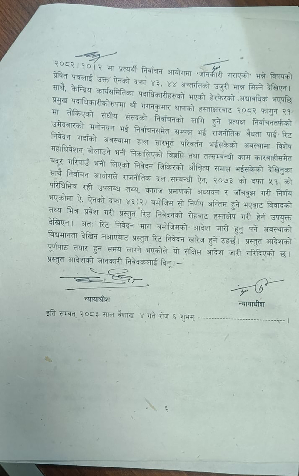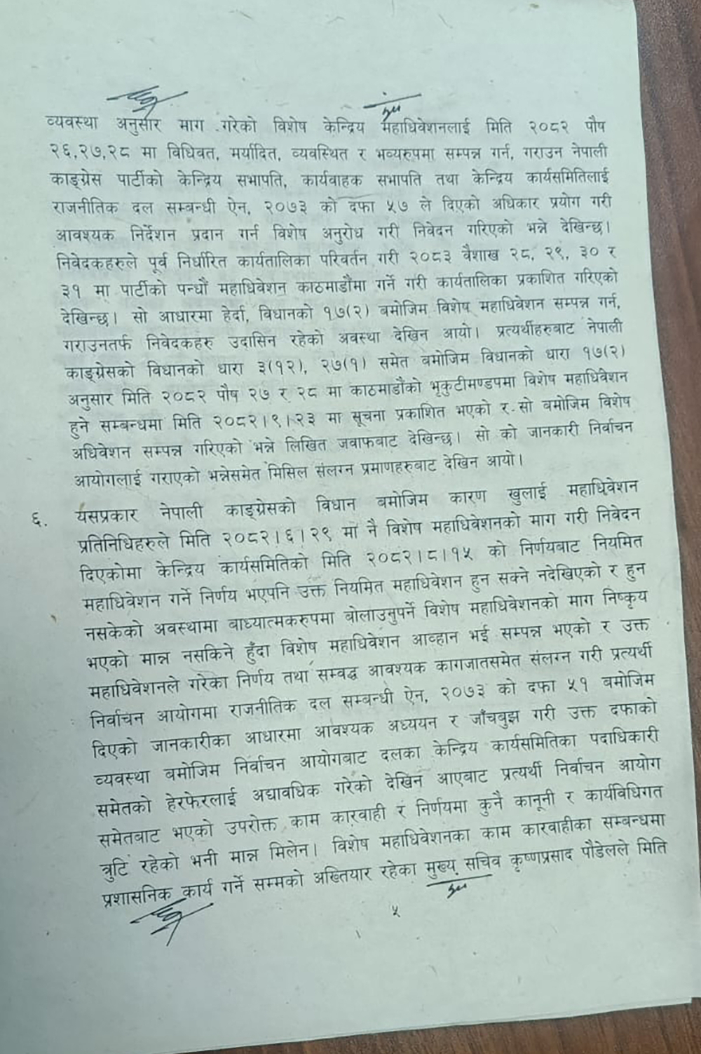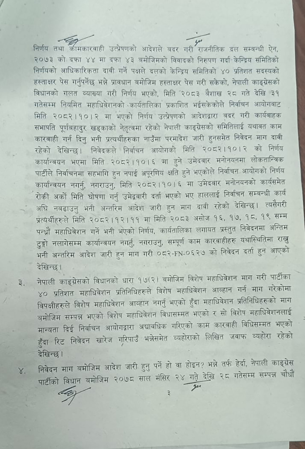 काठमाडौं । सर्वोच्च अदालतले गगन थापा नेतृत्वको कांग्रेसलाई आधिकारिकता प्रदान गरेको छ। योसँगैनेपाली कांग्रेसको आधिकारिकता कन विवाद टुंगिएको छ। सर्वोच्च अदालतमा विचाराधिन मुद्दामा आज अन्तिम सुनुवाई गरदै सर्वोच्चले विशेष महाधिवेशनबाट निर्वाचित नेतृत्वलाई आधिकारिकता दिएको हो।। न्यायाधीस न्यायाधीश द्वय शारडुना सुवेदी र निर्पधोज निरौलाको संयुक्तत इजलासले गगन कांग्रेसलाईलाई आधिकारिका दिएको हो। गगन नेतृत्वको कांग्रेसले गत मङ्सिर गत पुस अन्तिममा म विशेष महाधिवेश गर्दै कांग्रेसको नेतृत्व लिएका थिए । विशेष महाधिवेशन अवैधानिक भन्दै देउवा पक्ष निर्वाचन आयोगमा पुगेको थियो निर्वाचन आयोगले विशेषबाट निर्वाचित नेतृत्वलाई आधिकारिकता दिए पपश्त विषय अदालत प्रवेश गरेको थियो सर्वोच्च अदालतलेगगन थापाको नेतृत्व बन्यो आधिकारिक कांग्रेस अदालतले पनि प्रारम्भिक सुनवाई गर्दै गगन थापा नेतृत्वको कांग्रेसलाई आधिकारिकता दिएको थियो। सोही बमोजिम गगनको नेतृत्वमा कांग्रेस २०८२ फागुन २१ मा भएको आम निर्वाचनमा ओमिएको थियो। कांग्रेसको आजको यो निर्णयसँगै नियमित महाधिवेशन सभापति देउवाले गर्ने शेरबहादुर देउबा वा गगन थापा कसले गर्ने भन्ने विवाद पनि टुंगिएको छ। गगन पक्षले नियमित महाधिवेशनको कार्यतालिका समेत सार्वजनिक गरेको छ। यसअघि विशेष महाधिवेशन अघि नै देउवापक्षले महाधिवेशनको कार्यतालिका सार्वजनिक गरेको छ। पछिल्लो चरणमा नेपाली कांग्रेसभित्र को आधिकारिकता भन्ने विवाद चुलिएको छ। केही दिनअघि मात्र पूर्णबहादुर खड्काले कार्यवाहक सभापतिको रुपमा विज्ञप्ति निकालेको भन्दै लेटर प्याडको दुरुपयोग गरेको भनी गगन पक्षले साथ दिने स्पष्टीकरण सोधेको छ। भने आफूलाई संस्थापन कांग्रेस भन्ने देउवा पक्षले विशेष महाधिवेशन अवैधानिक भन्दै दाबी गर्दै आएको छ। सर्वोच्चको आजको यो निर्णयसँगै कांग्रेसभित्रको सम्पूर्ण विवाद कानुनी रूपमा टुङ्गिएको छ