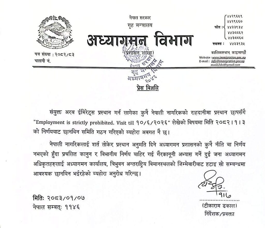 उनीहरुले संयुक्त अरब इमिरेट्स (यूएई) जान लागेका नेपालीको राहदानीमा नीतिविपरीत विदेश गएर काम गर्न नपाउने र नेपाल फर्किने मितिसहितको थप नोट लेखेका थिए। विभागले नेपाली नागरिकलाई शर्त तोकेर प्रस्थान अनुमति दिने अध्यागमन प्रशासनको कुनै नीति वा निर्णय नभएको स्पष्ट पारेको छ।