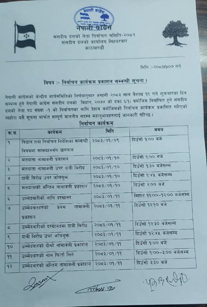 दलको नेता छान्नका लागि १० गते दिउँसो १ बजे मतदाता नामावली प्रकाशन गरिने र उम्मेदवारहरूको अन्तिम नामावली भने ११ गते दिउँसो साढे ३ बजे गरिने कार्यतालिका रहेको छ।