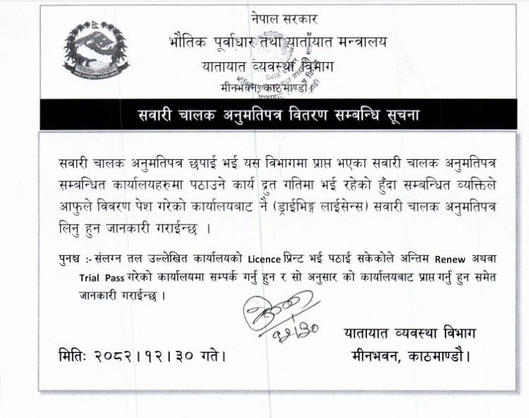 विभागले एक सूचना जारी गर्दै छपाई भएका लाइसेन्सहरू द्रुत गतिमा सम्बन्धित कार्यालयहरूमा पठाउने कार्य भइरहेको र सेवाग्राहीले सम्बन्धित कार्यालयबाटै लाइसेन्स लिन सक्ने जानकारी दिएको हो ।