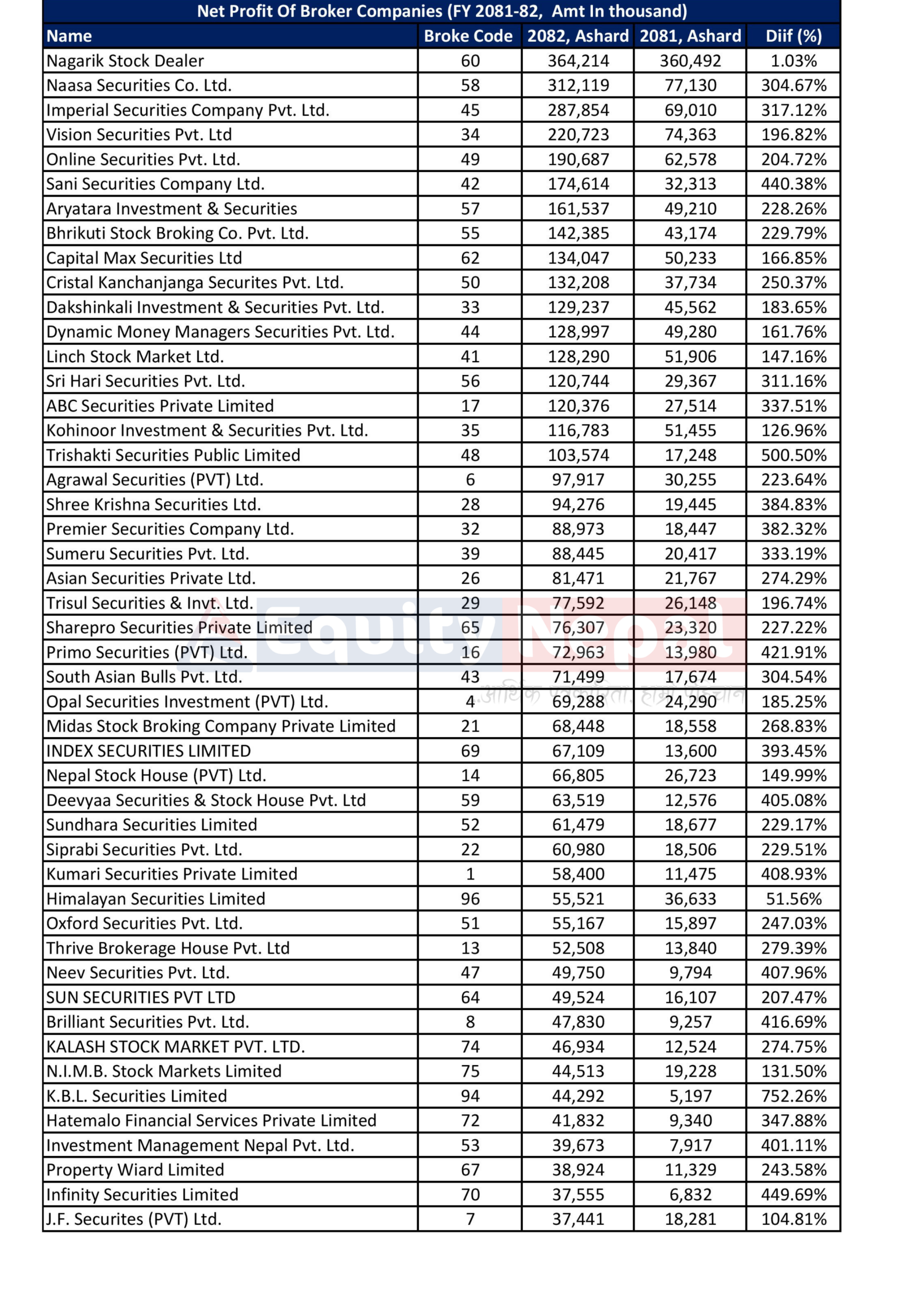 हाल ९२ वटा ब्रोकर कम्पनीहरुले धितोपत्र कारोबार गर्दै आएका भए पनि यो विवरण ८९ कम्पनीहरुको खुद नाफामा आधारित छ । आर्थिक वर्ष २०८१/८२ को अन्तिम कारोबार दिन, अर्थात् २०८२ को असार ३२ गते  नेप्से सूचक २२४० विन्दुमा बन्द भएको थियो । त्यसपछि बजारमा तीव्र वृद्धि आएर साउन ३१ गतेसम्म सूचक ३ हजार विन्दुसम्म पुगेको थियो । यस अवधिमा दैनिक कारोबार रकम २९ अर्ब रुपैयाँसम्म पुगेको थियो ।