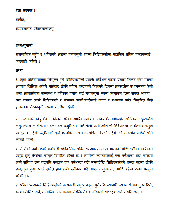 काठमाडौं । सत्ताको शक्तिको कारण गैरकानुनी रुपमा सीडीएस एण्ड क्लियरिङ लिमिटेड (सीडीएस) को प्रमुख बनेको भन्दै प्रविन पन्दकालाई कारबाही गर्न माग गर्दै उजुरी परेको छ । हेलो सरकारमार्फत् प्रधानमन्त्री बालेन्द्र शाहलाई पत्र लेख्दै गैरकानुनी नियुक्ति लिएको आरोपमा पन्दाकलाई कारबाही गर्न उजुरीकर्ताले माग समेत गरेको छ ।