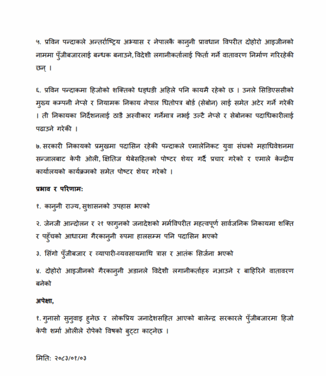 ‘प्रविन पन्दाकले सिडिएससीको कार्यकारी प्रमुख पदमा पुगेपछि व्यापारी व्यवसायीलाई दुःख दिने, ब्ल्याकमेलिङ गर्ने, सामाजिक सन्जालमा गैरजिम्मेवार तरिकाले पोष्टहरु गर्ने गरेकी छन् । प्रविन पन्दाकले अन्तर्राष्ट्रिय अभ्यास र नेपालकै कानुनी प्रावधान विपरीत दोहोरो आइजीनको नाममा पुँजीबजारलाई बन्धक बनाउने, विदेशी लगानीकर्तालाई फिर्ता गर्ने वातावरण निर्माण गरिरहेकी छन् ।प्रविन पन्दाकमा हिजोको शक्तिको धड्धडी अहिले पनि कायमै रहेको छ । उनले सिडिएससीको मुख्य कम्पनी नेप्से र नियामक निकाय नेपाल धितोपत्र बोर्ड (सेबोन) लाई समेत अटेर गर्ने गरेकी ती निकायका निर्देशनलाई ठाडै अस्वीकार गर्नेमात्र नभई उल्टै नेप्से र सेबोनका पदाधिकारीलाई पढाउने गरेकी छिन्,’उजुरीमा भनिएको छ ।