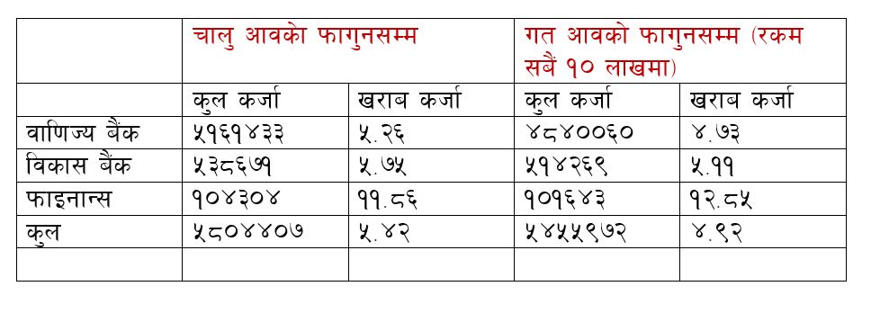 वाणिज्य बैंकहरूले मात्र चालु आवको फागुनसम्म कुल ७० खर्ब १६ अर्ब २३ करोड ७० लाख निक्षेप संकलन गरी ५१ खर्ब ६१ अर्ब ४३ करोड ३० लाख कर्जा प्रवाह गरेका छन् । उक्त कर्जा प्रवाहमध्ये वाणिज्य बैंकको खराब कर्जा ५.२६ अर्थात् २ खर्ब ७१ अर्ब ४९ करोड रहेको छ ।गत आवको सोही अवधिमा वाणिज्य बैंकहरूले कुल ६० खर्ब ४१ अर्ब २१ करोड ५० लाख निक्षेप संकलन गरी ४८ खर्ब ४० अर्ब छ करोड कर्जा प्रवाह गरेका थिए । जसमध्ये ४.७३ प्रतिशत खराब कर्जा रहेको थियो ।