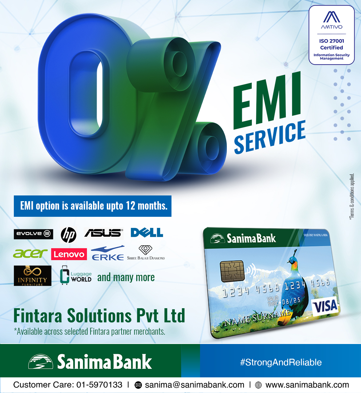 यस सहकार्य अन्तर्गत, बैंकका ग्राहकहरुले फिन्तारासँग आबद्व मर्चेन्ट स्टोरहरुमा सानिमा बैंकको क्रेडिट कार्ड प्रयोग गरि सामान खरिद गर्दा आधिकतम १२ महिनासम्म 0% ब्याजमा EMI सुविधा उपभोग गर्न सक्नेछन् । यो सुविधा इलेक्ट्रोनिक्स, मोबाइल सेट, ल्यपटप, फर्निचर, माउन्टेन बाइक, घरेलु उपकरण आदि खरिद गर्दा उपभोग गर्न सकिने छ ।