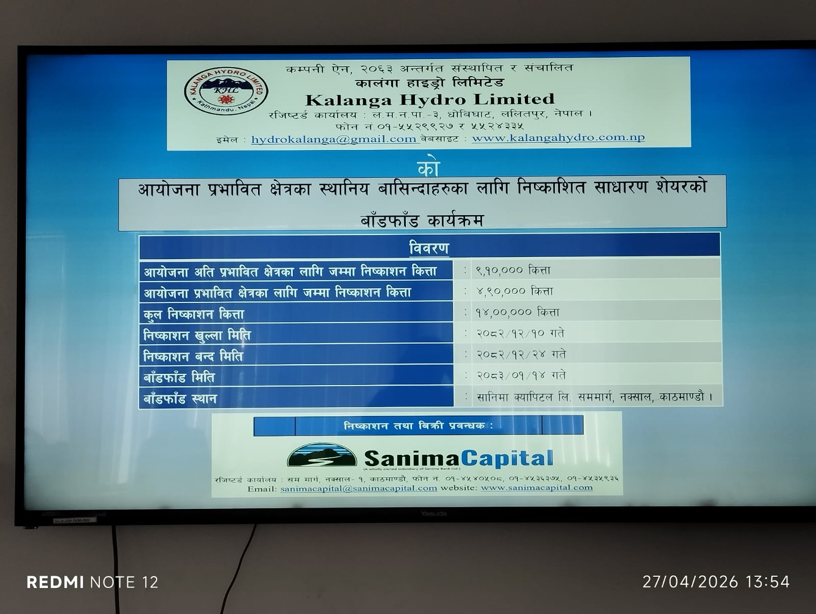 काठमाडौं । कालंगा हाइड्रो लिमिटेडले आयोजना प्रभावित क्षेत्रका स्थानीय बासिन्दालाई बिक्री गरेको सेयर बाँडफाट भएको छ । सानिमा क्यापिटलमा सेयर बाँडफाँट गरिएको हो । कम्पनीले स्थानीयलाई ४ लाख ९० हजार कित्ता सेयर जारी गरेको थियो । जसमध्ये आवेदन दिएका सबैले सेयर पाएका छन् ।