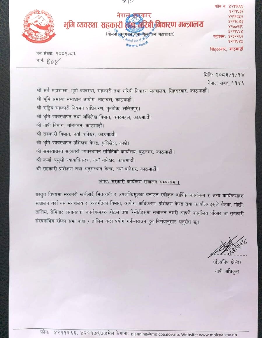 मन्त्रालयको योजना अनुगमन तथा मूल्याकंन महाशाखाले आज सबै महाशाखा, आयोग, प्राधिकरण, विभाग तथा कार्यालयहरूलाई परिपत्र गर्दै सरकारी खर्चलाई मितव्ययी र उपलब्धिमूलक बनाउन यस्तो निर्देशन दिएको हो ।