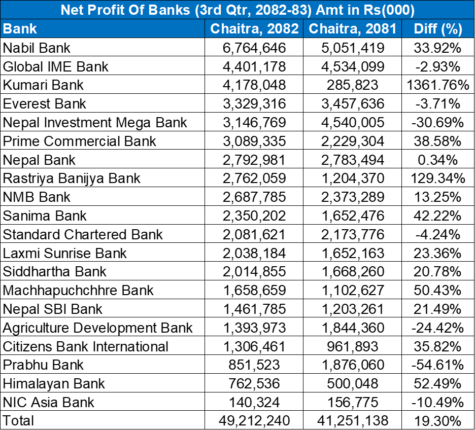 रिपोर्ट अनुसार सबैभन्दा धेरै नाफा आर्जन गर्नेमा नबिल बैंक अगाडि रहेको छ । यसले ९ महिनामा ६ अर्ब ७६ करोड नाफा कमाएको छ । त्यसपछि, ग्लोबल आइएमईले ४ अर्ब ४० करोड, कुमारीले ४ अर्ब १७ करोड, एभरेष्ट बैंकले ३ अब ३२ करोड, नेपाल इन्भेष्टमेन्ट मेगाले ३ अर्ब १४ करोड, प्राइम कमर्सियलले ३ अर्ब ८ करोड नाफा कमाएको छ ।